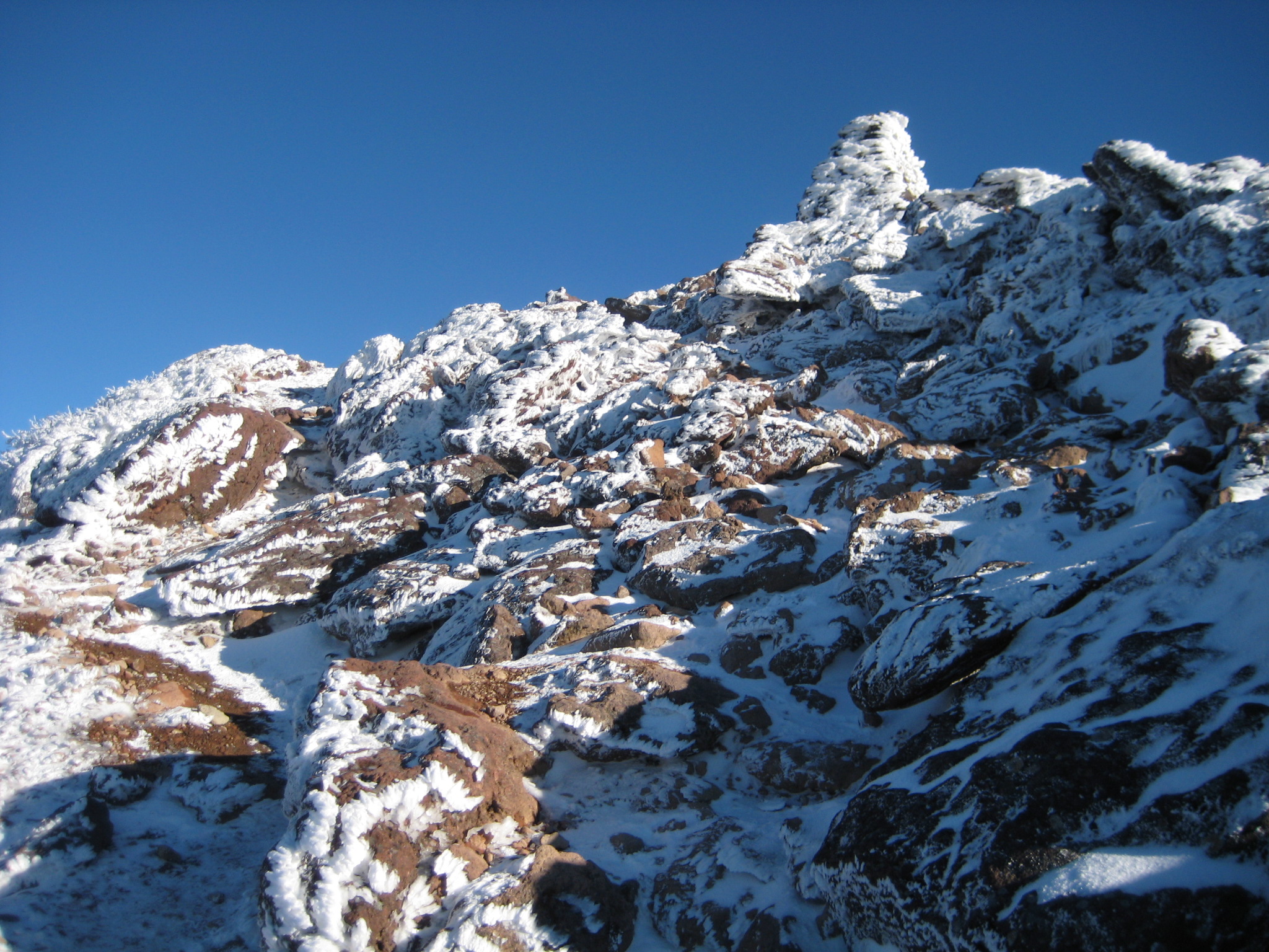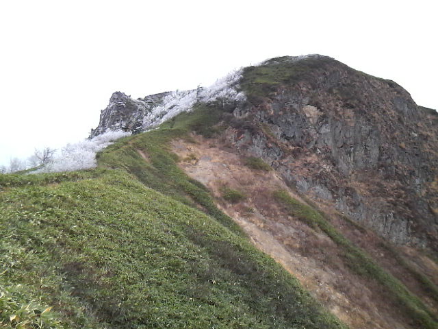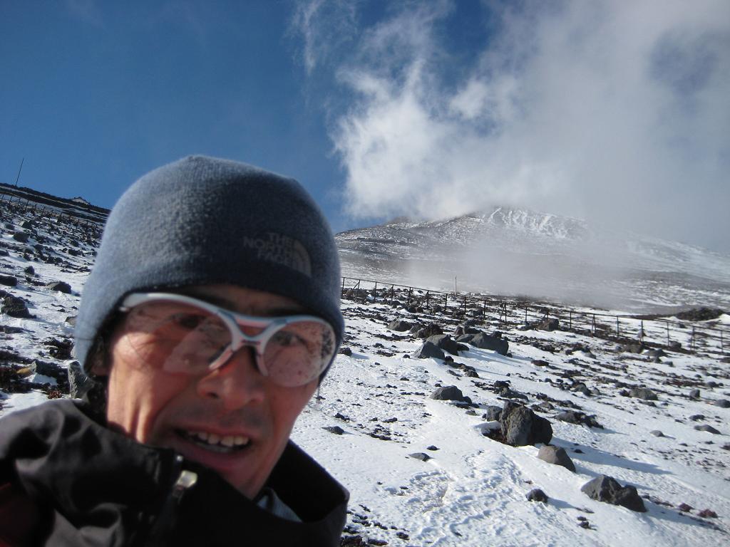 ちょうど標高2000mラインに不穏な雲(中央写真)が、この雲の中に入ると凄まじい吹雪が・・・。山頂でとりあえずの記念写真を撮り、一目散に高度を下げるために駆け下りてきました。安全地帯まで駆け下り、振り返るとおどろおどろしい山容が・・・。厳しい局面を切り抜けた後のホットした感じが結構くせになります。