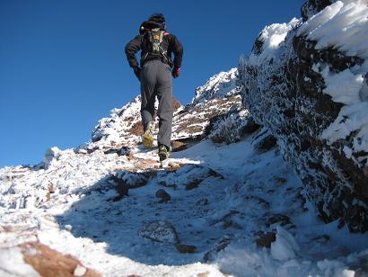 でも、マイペース。「夜間ランも悪くはないかな」、と思いつつ久々の一人ぼっちの高地トレラン。みどり池を過ぎ、途中からトレイルの表土に雪が覆いはじめましたが、それほどの積雪でもなかったので気にせず進み、本沢温泉へ。そこから更に上へ上へ、そして硫黄岳。正面に雪をまとった赤岳が・・・、すごい綺麗。しばし見とれ。