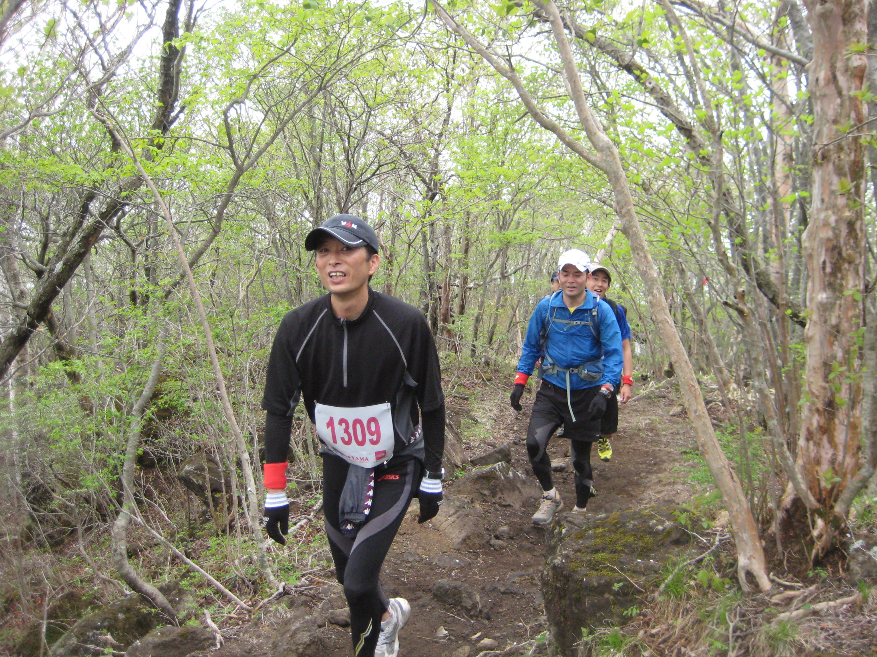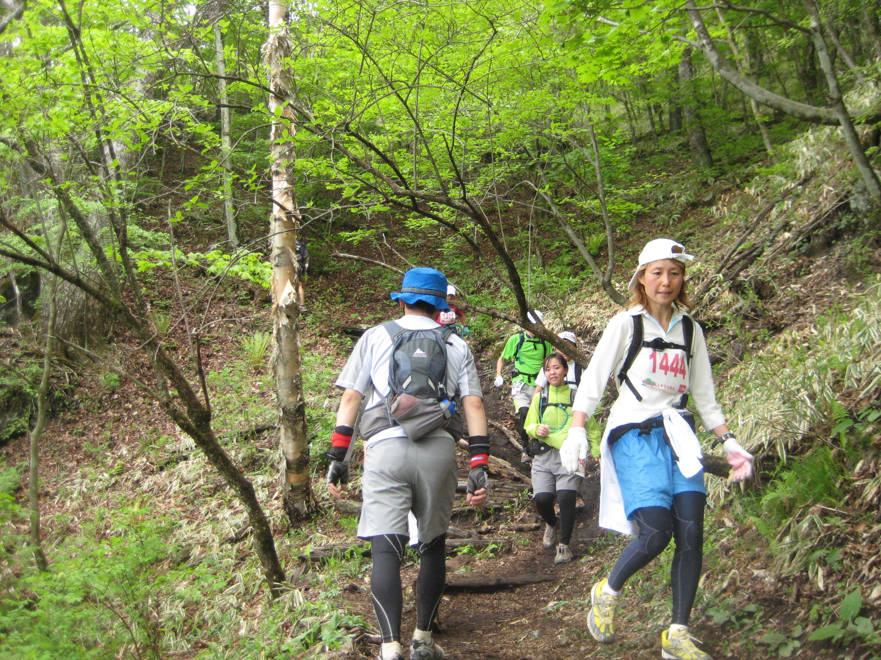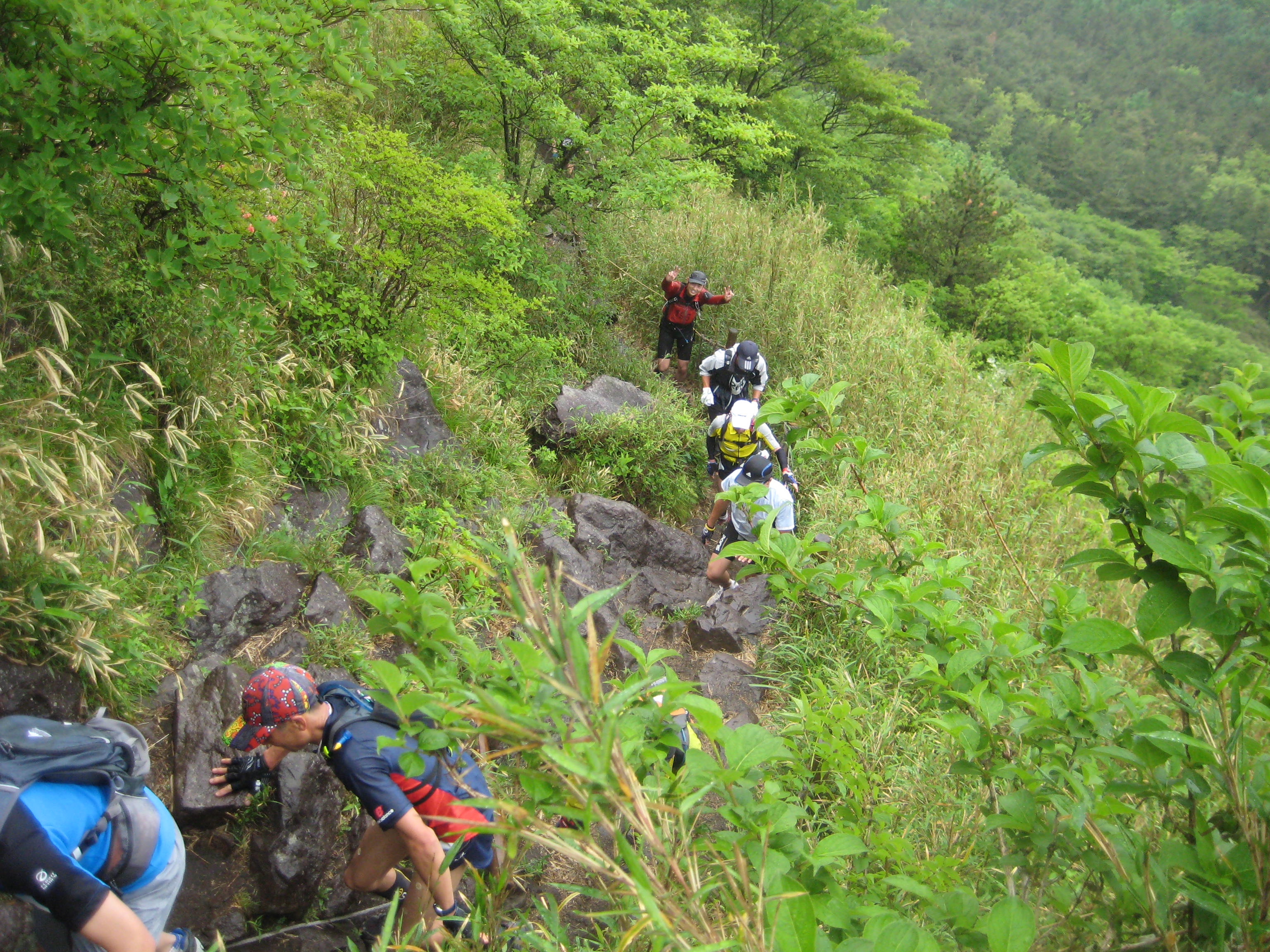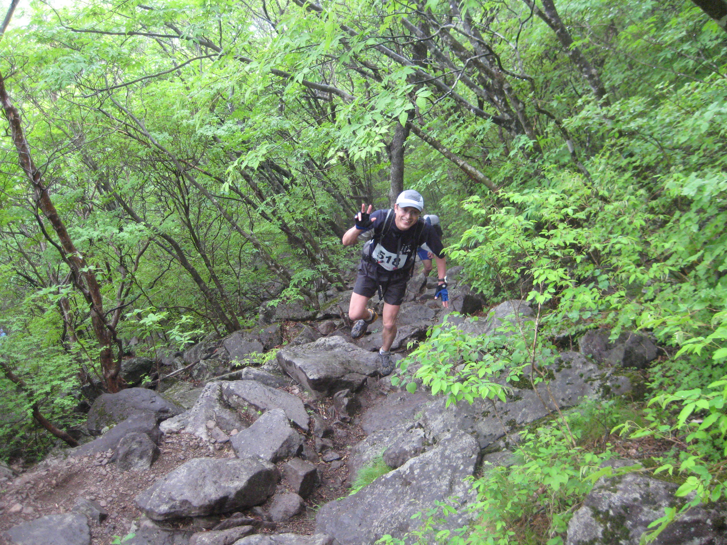 北丹沢のレースは7月の炎天下の中、大ピーク2つ、中ピーク2つの国内屈指の難コース。1日目は、前半の大1、中1のピークを攻略。皆さん胸が付くほどの急登りに悪戦苦闘。